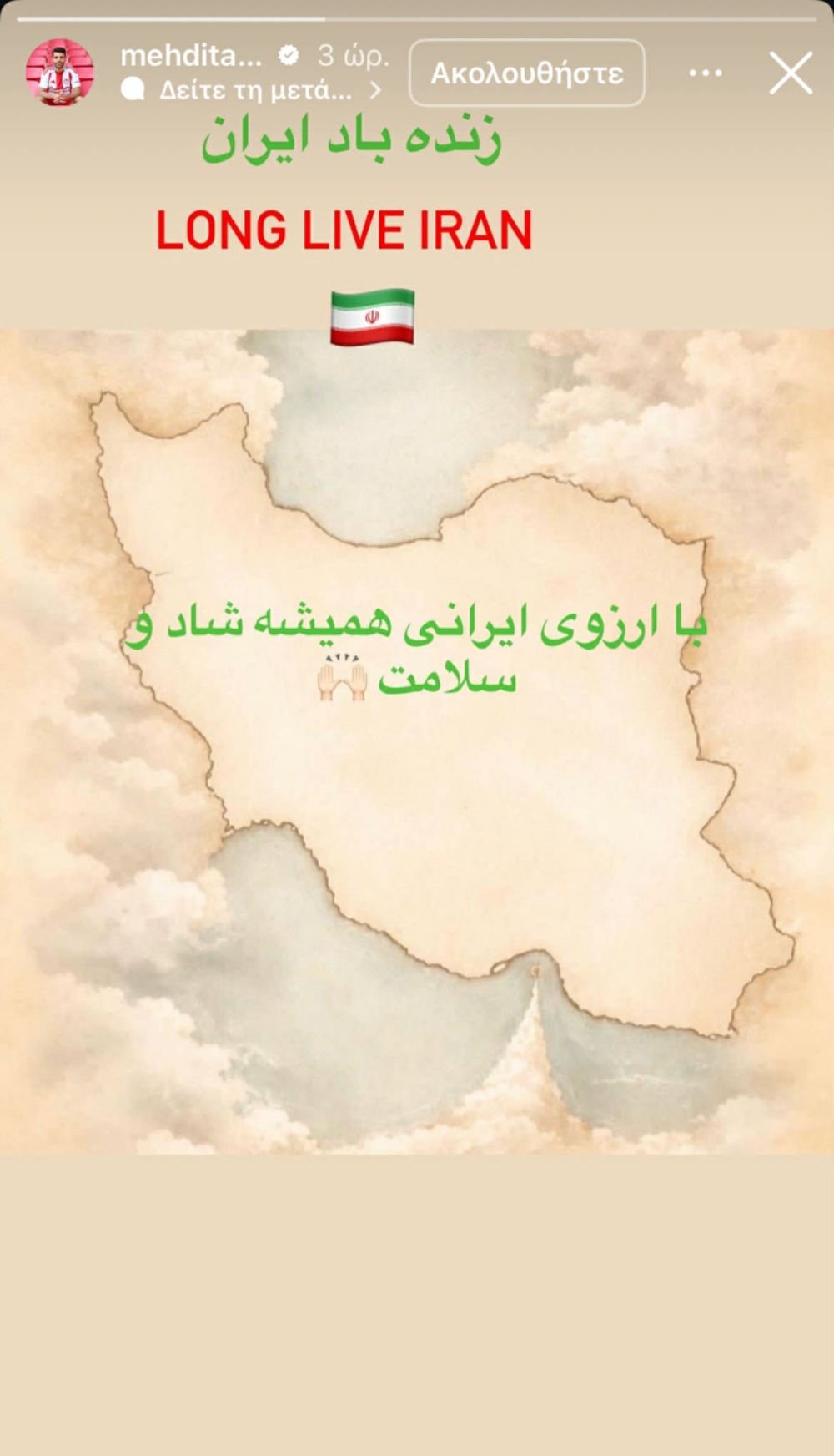 Με αφορμή τις εξελίξεις στην Μέση Ανατολή, ο Μεχντί Ταρέμι πήρε θέση υπέρ της πατρίδας του, μέσω ανάρτησης στον προσωπικό του λογαριασμό στο Instagram. O διεθνής στράικερ του Ολυμπιακού ανέβασε μια φωτογραφία με χάρτη της χώρας, γράφοντας χαρακτηριστικά «Να ζήσει το Ιράν».