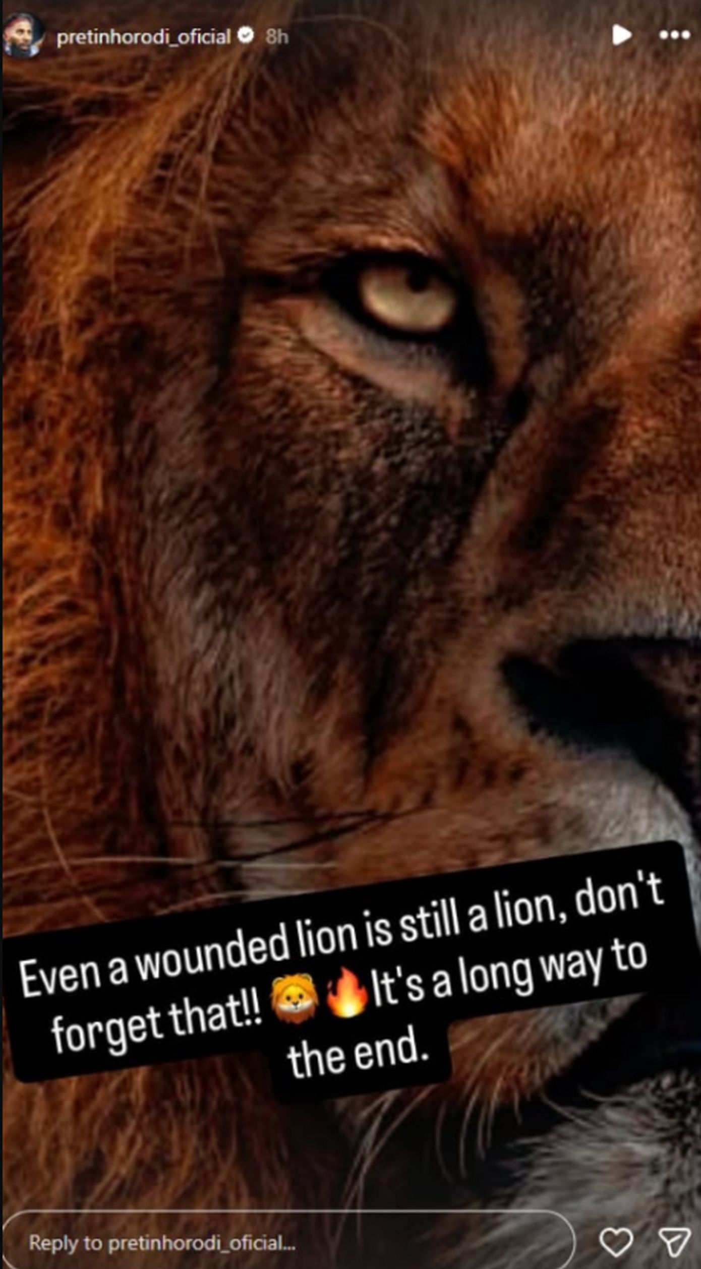 Ο έμπειρος Βραζιλιάνος δεξιός μπακ του Ολυμπιακού έγραψε χαρακτηριστικά: «Ακόμα και ένα πληγωμένο λιοντάρι παραμένει λιοντάρι. Μην το ξεχνάτε αυτό! Είναι μακρύς ο δρόμος έως το τέλος», στέλνοντας ένα μήνυμα με ξεκάθαρο αγωνιστικό και ψυχολογικό περιεχόμενο.