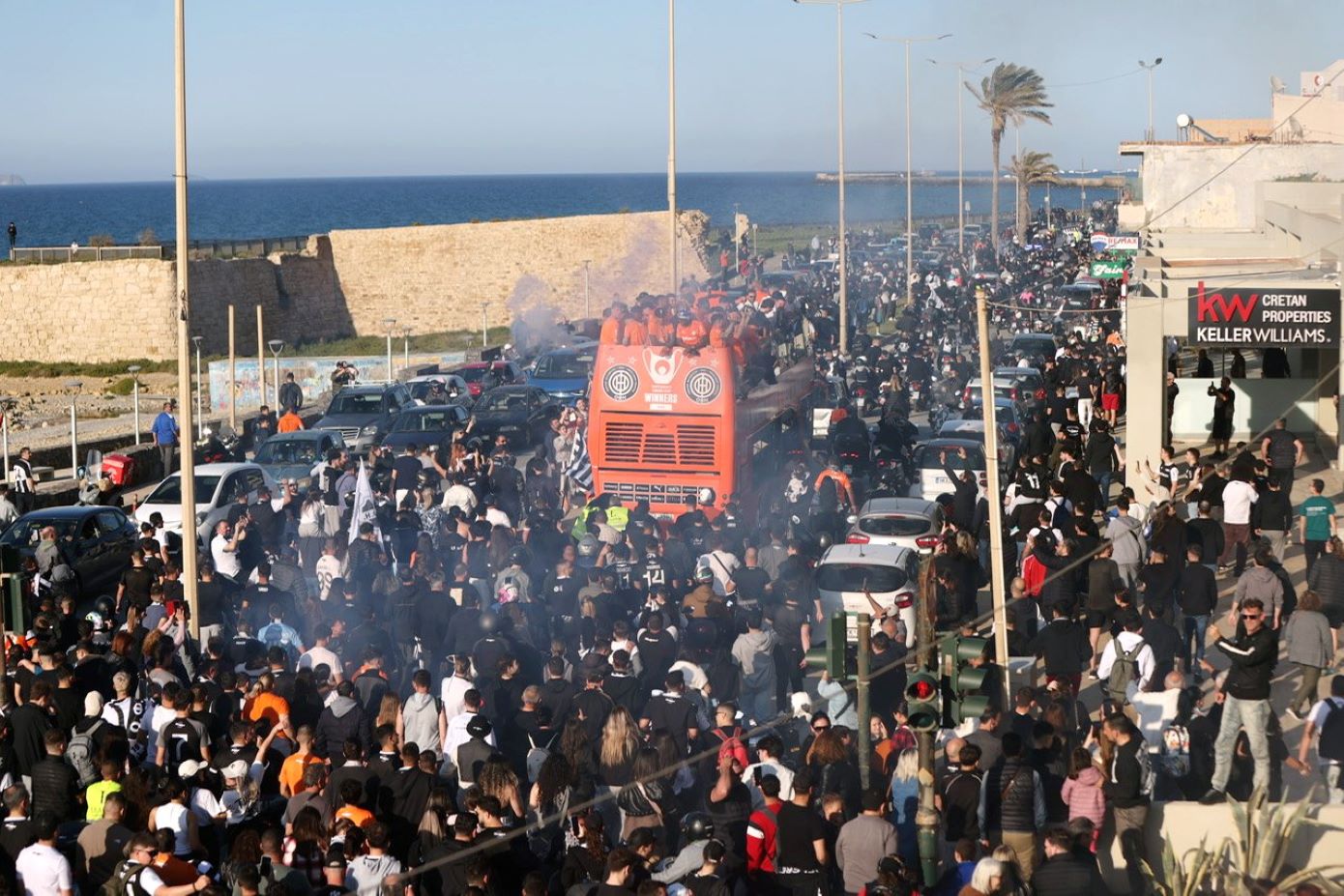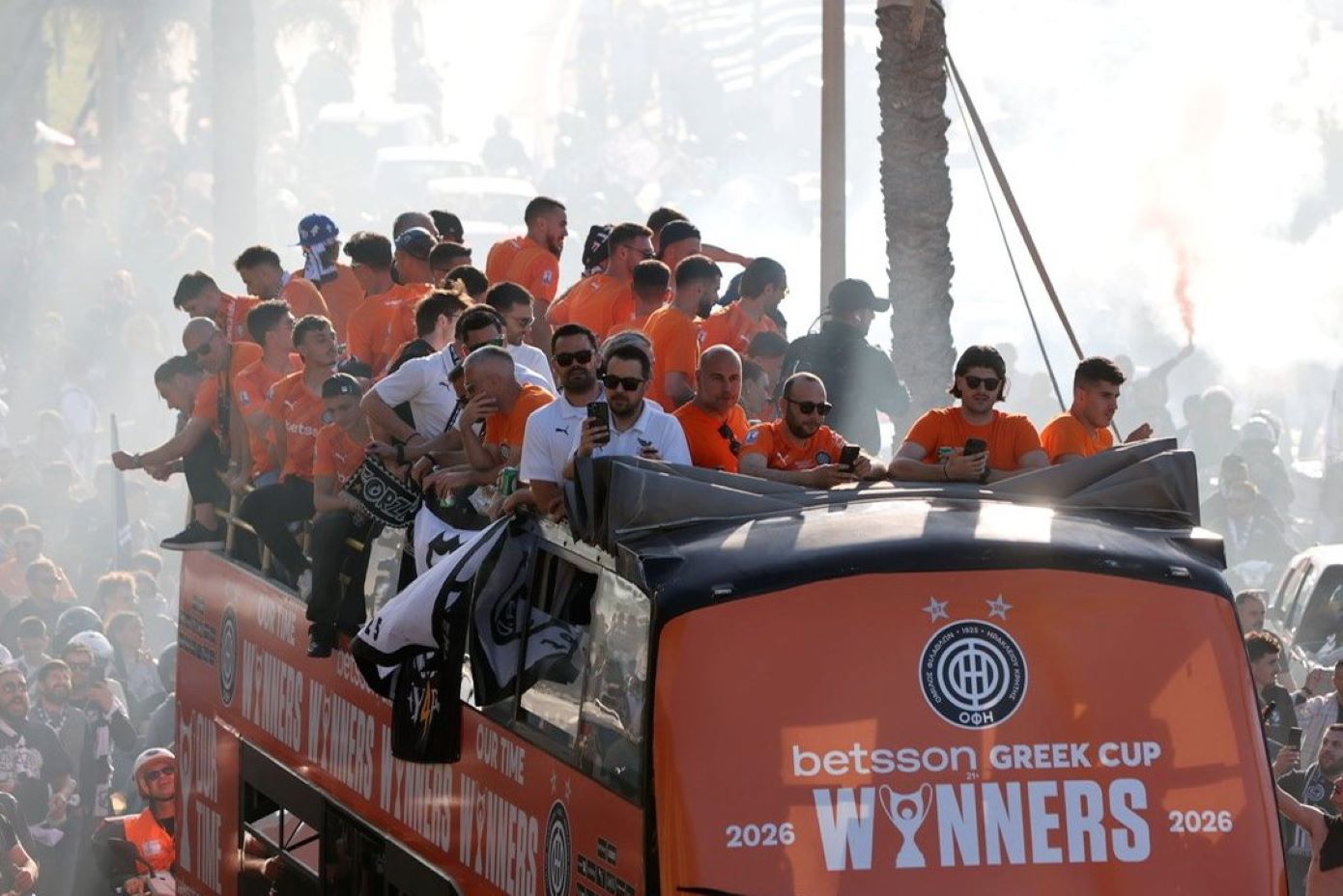 Το Ηράκλειο βγήκε στους δρόμους και αποθέωσε τους Κυπελλούχους Ελλάδος Ο Χρήστος Κόντης με τους ποδοσφαιριστές του επιβιβάστηκαν στο ανοιχτό πούλμαν, το οποίο ήταν πορτοκαλί και ξεκίνησε η πανηγυρική παρέλαση.