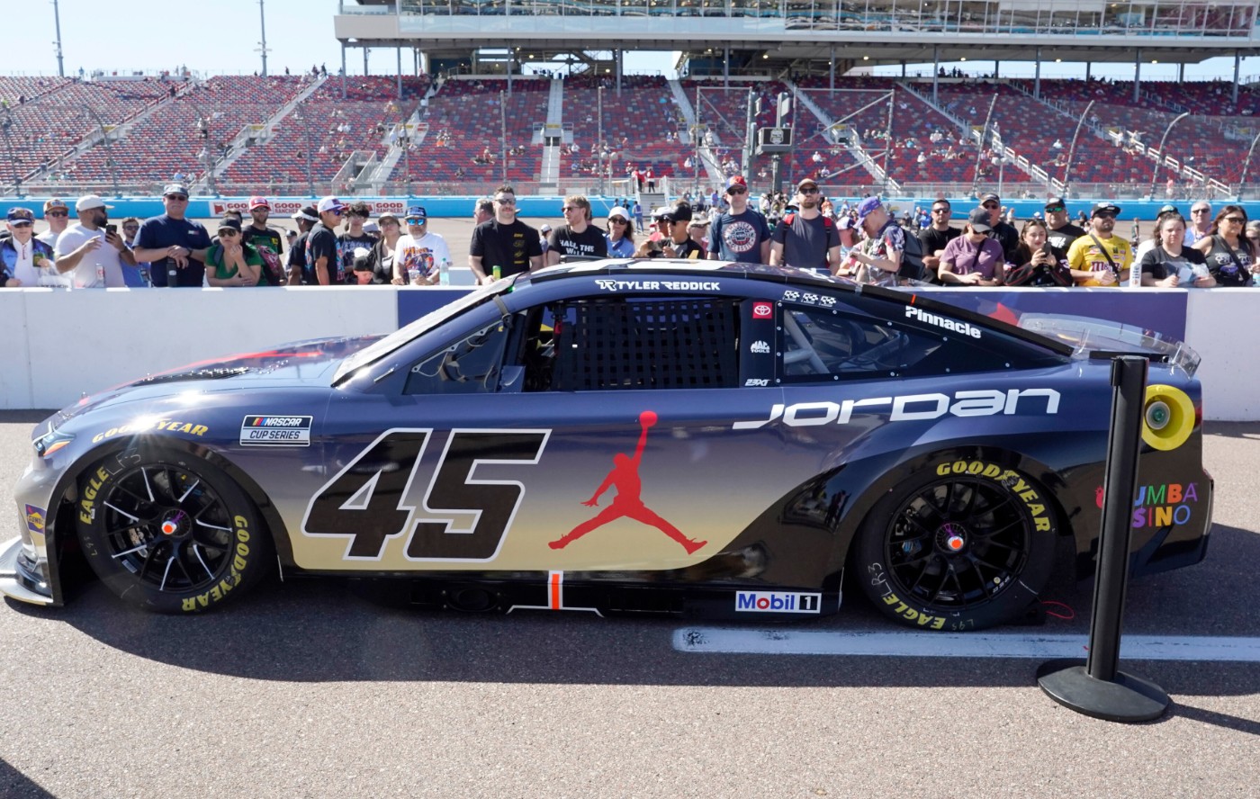 Michael Jordan’s 23XI Race car driven by Tyler Reddick (45) on pit row before a NASCAR Cup Series auto race at Phoenix Raceway, Sunday, March 8, 2026, in Avondale, Ariz. (AP Photo/Darryl Webb)