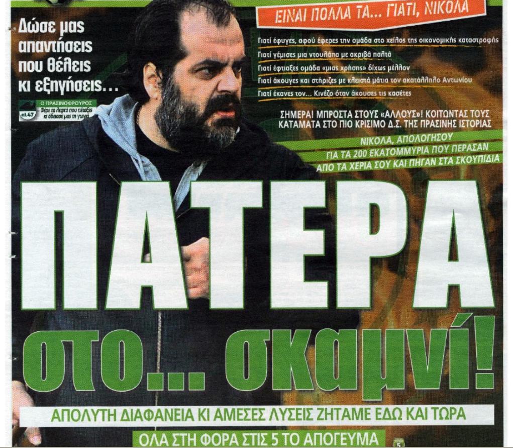 Ο Παύλος Γιαννακόπουλος έριξε καρφιά κατά του Νίκου Πατέρα σε χθεσινοβραδινή τηλεοπτική συνέντευξη και η εφημερίδα «Πράσινη» έστειλε νέο μήνυμα με δεύτερο εξώφυλλο που απευθύνεται στον πρώην πρόεδρο.