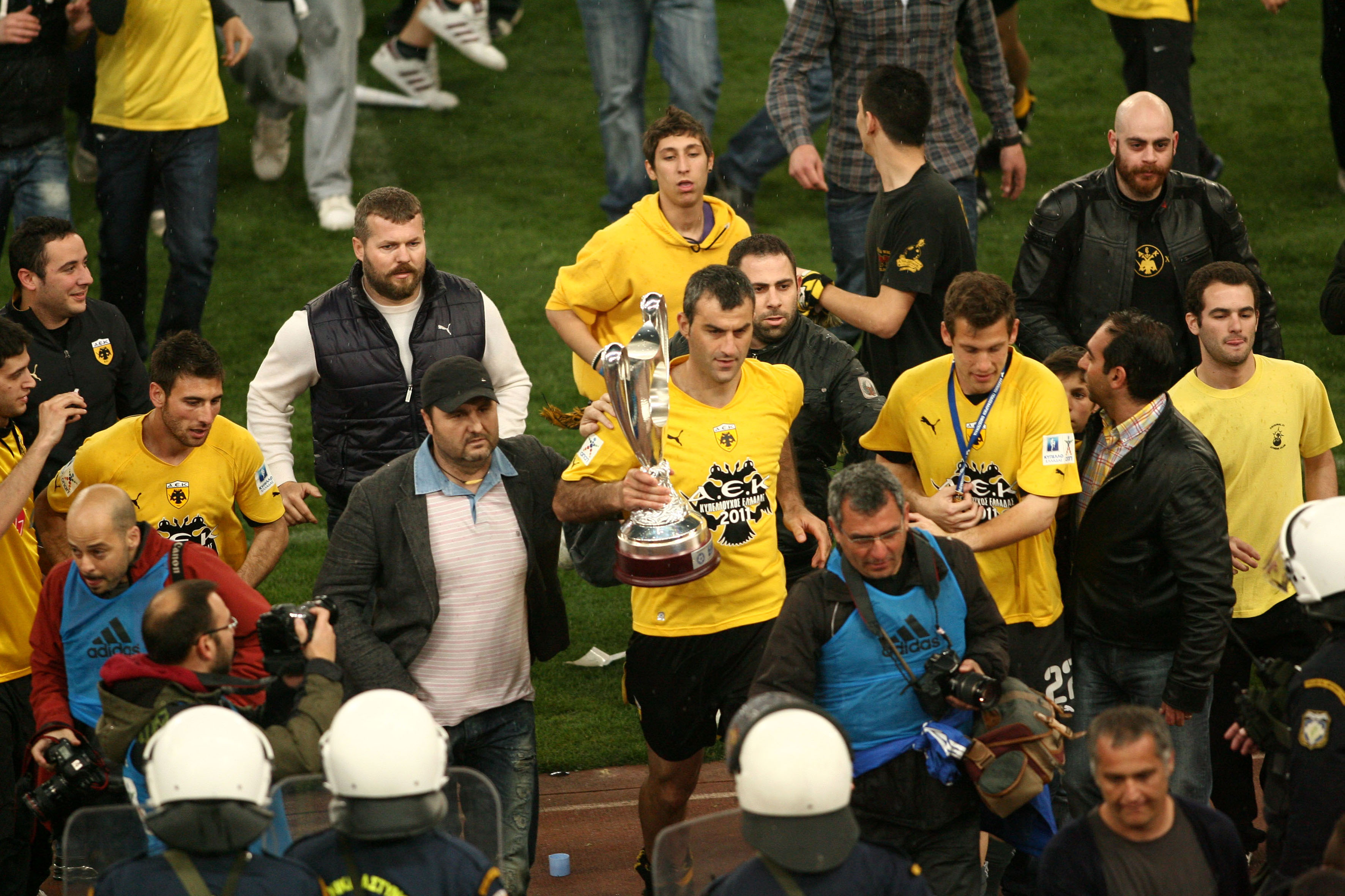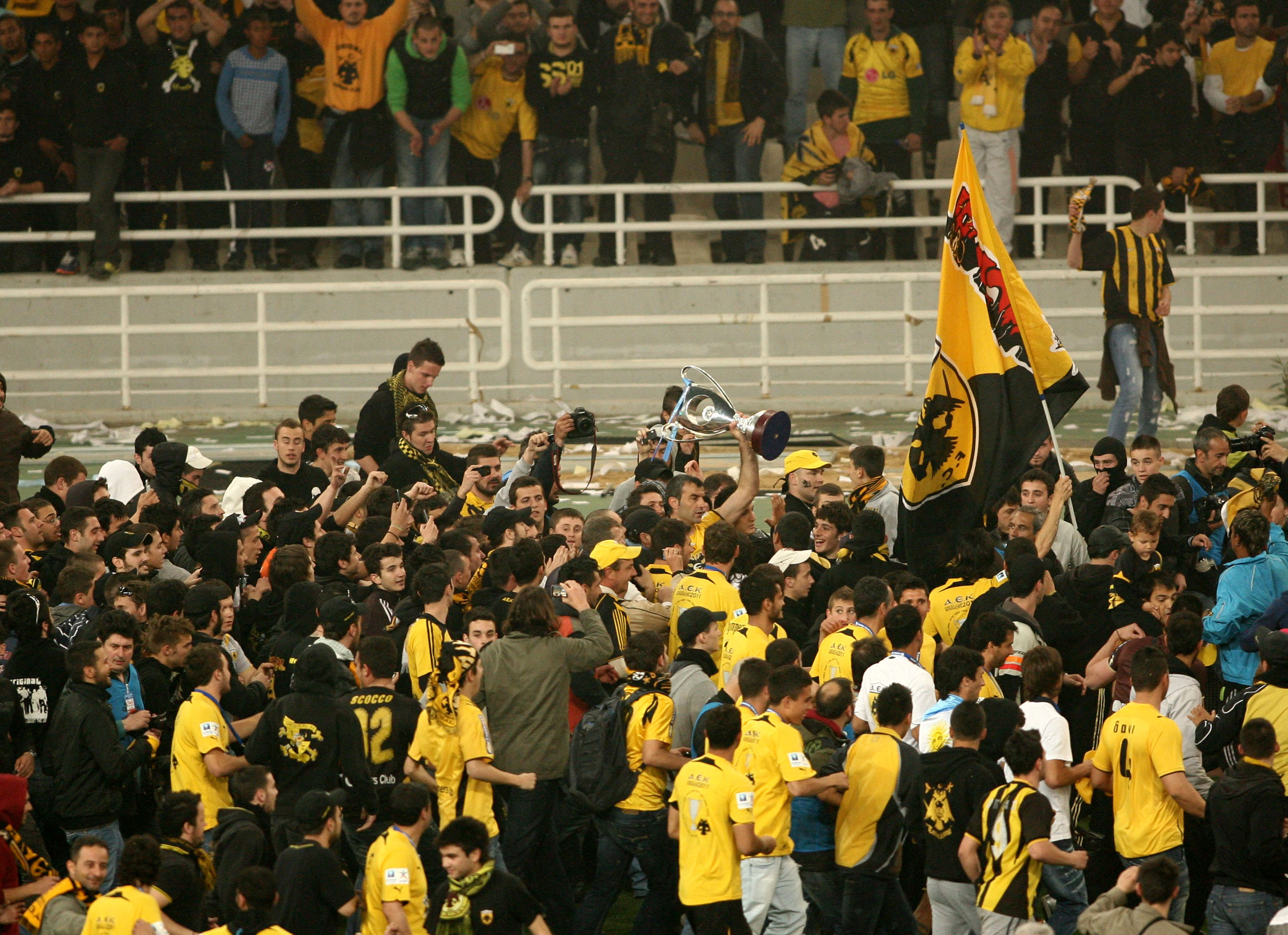 Έκδηλη η χαρά της ΑΕΚ, αφού μετά από 9 χρόνια κατακτά τίτλο σε μια αρκετά δύσκολη περίοδο για την ομάδα. Ο πρώτος τίτλος μετά το 2002 είναι γεγονός για την ΑΕΚ παρόλο που δεν εντυπωσίασε με την απόδοσή της.