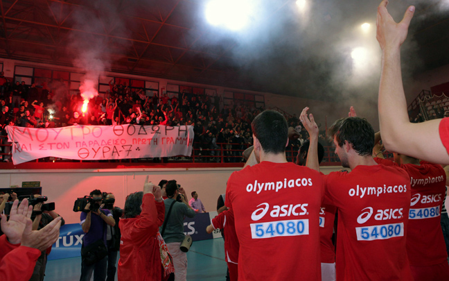 Με το τέλος του παιχνιδιού, οι θύρες άνοιξαν και οι φίλοι του Ολυμπιακού γιόρτασαν μαζί με τους παίκτες και το τεχνικό τιμ! Φανταστική ατμόσφαιρα στο «Μελίνα Μερκούρη».