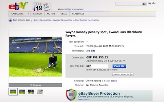 Σε δημοπρασία στο e-bay βγήκε η άσπρη βούλα από την οποία ο Γουέιν Ρούνεϊ χάρισε στη Μάντσεστερ Γιουνάιτεντ το 19ο πρωτάθλημα στην ιστορία της ισοφαρίζοντας με πέναλτι σε 1-1 την Μπλάκμπερν στο «Ίγουντ Παρκ».