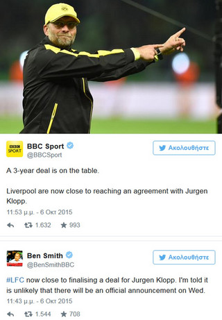 Προπονητής της Λίβερπουλ θα πρέπει να θεωρείται ο Γιούργκεν Κλοπ, αφού το «BBC» υποστηρίζει ότι οι δύο πλευρές φέρονται να βρίσκονται κοντά σε συμφωνία. Μάλιστα, το βρετανικό δίκτυο αναφέρει ότι δεν αποκλείεται να υπάρξουν ανακοινώσεις ακόμα και μέσα στην ημέρα, με τον Γερμανό προπονητή να απαντάει θετικά στην πρόταση για τριετή συνεργασία που έχει δεχθεί από τους «κόκκινους». Η πιθανότερη ημέρα παρουσίασης του πρώην τεχνικού της Ντόρτμουντ είναι η Παρασκευή, αλλά ημέρα – κριτήριο για τις εξελίξεις είναι η Πέμπτη. Δείτε τα σχετικά tweets