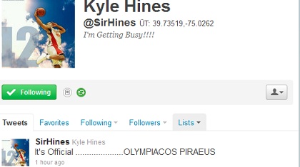 Τη συμφωνία με τον Ολυμπιακό έσπευσε να επιβεβαιώσει μέσω του Twitter, ο Κάιλ Χάινς. Ο Αμερικανός φόργουορντ, ο οποίος -εκτός συγκλονιστικού απροόπτου- θα φορά τα ερυθρόλευκα από την επόμενη σεζόν, αρκέστηκε στη φράση: «Είναι επίσημο… Ολυμπιακός Πειραιώς».