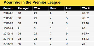 Η αναμέτρηση της Τσέλσι με τη Λέστερ (νίκη με 2-1 για την ομάδα του Κλαούντιο Ρανιέρι) την περασμένη Δευτέρα έμελλε να είναι και η τελευταία του Ζοσέ Μουρίνιο στον πάγκο των Λονδρέζων. Ο Πορτογάλος τεχνικός πρόλαβε να καθοδηγήσει τους «Μπλε» σε 212 αναμετρήσεις στην Premier League, με τον απολογισμό του σε αυτά τα ματς να είναι εντυπωσιακός. 140 νίκες, 44 ισοπαλίες και 28 ήττες, με τις 9 εξ αυτών να έρχονται φέτος, στη χειρότερη σεζόν του Μουρίνιο επί αγγλικού έδάφους. Αναλυτικά στον παρακάτω πίνακα τα στατιστικά του Ζοσέ Μουρίνιο στην Premier League.