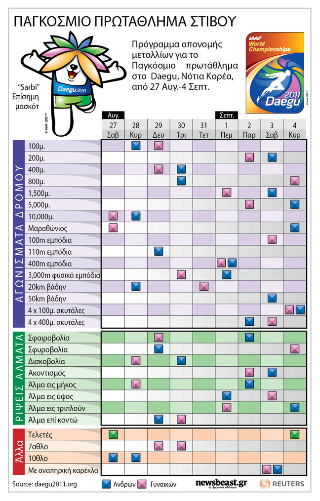 Από τις 27 Αυγούστου μέχρι τις 4 Σεπτεμβρίου θα πραγματοποιηθεί το Παγκόσμιο Πρωτάθλημα Στίβου στο Νταεγού της Νότιας Κορέας. Την Ελλάδα θα εκπροσωπήσουν συνολικά 12 αθλητές, πέντε γυναίκες και επτά άνδρες.