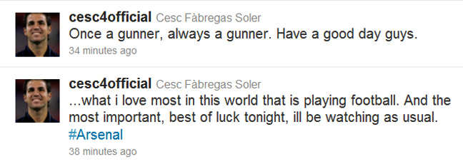 Ο Σεσκ Φάμπρεγας μπορεί να ανήκει πλέον στην Μπαρτσελόνα, αλλά δεν ξεχνά την Άρσεναλ. Ο Καταλανός μέσος ευχήθηκε στην παλιά του ομάδα καλή επιτυχία στον αποψινό πρώτο αγώνα με την Ουντινέζε για τα play offs του Champions League στο Λονδίνο μέσα της σελίδας του στο Twitter.