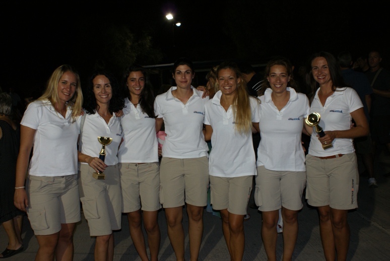 Τα κορίτσια του πληρώματος με τα κύπελλα διάκρισης του πρώτου σκέλους στην τοπική απονομή στο Αγκίστρι.