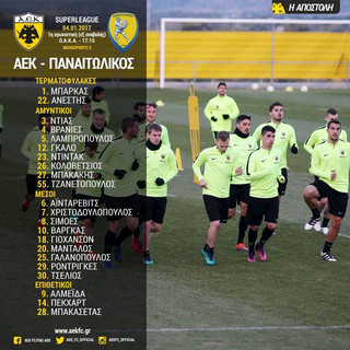 Άμεσα θα έχει στη διάθεσή του τα δύο πρώτα αποκτήματα της ΑΕΚ για τον Ιανουάριο ο Ζοσέ Μοράις. Ο Πορτογάλος τεχνικός επέλεξε για την αποστολή του ματς της Τετάρτης με τον Παναιτωλικό στο ΟΑΚΑ τους Αστρίτ Αϊντάρεβιτς και Όγκνιεν Βράνιες. Διαθέσιμος μετά από καιρό είναι ξανά ο Τάσος Μπακασέτας, ενώ θα λείψουν ο τιμωρημένος Χρήστος Αραβίδης, καθώς και ο Ντμίτρο Τσιγκρίνσκι, που πάντως σήμερα προπονήθηκε κανονικά. Αναλυτικά η 22μελής αποστολή: Ανέστης, Μπάρκας, Λαμπρόπουλος, Γκάλο, Ντίντακ, Κολοβέτσιος, Μπακάκης, Βράνιες, Τζανετόπουλος, Ντίας, Σιμόες, Βάργκας, Γιόχανσον, Γαλανόπουλος, Αϊντάρεβιτς, Μάνταλος, Τσέλιος, Ροντρίγκες, Χριστοδουλόπουλος, Πέκχαρτ, Μπακασέτας, Αλμέιδα.