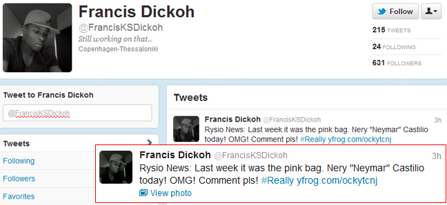 «Νέα από το Ρύσιο: Την προηγούμενη εβδομάδα ήταν η ροζ τσάντα. Σήμερα Νέρι “Νεϊμάρ” Καστίγιο. Σχόλια παρακαλώ…», έγραψε ο Γκανέζος αμυντικός στην προσωπική του σελίδα στο Twitter και ανέβασε τη φωτογραφία στην ιστοσελίδα κοινωνικής δικτύωσης.
