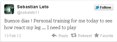 Ο Λέτο έγραψε στην προσωπική του σελίδα στο Twitter: «Καλημέρα! Σήμερα θα ακολουθήσω ατομικό πρόγραμμα για να δούμε πώς αντιδρά το πόδι μου… Έχω την ανάγκη να παίξω»!