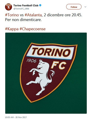 Ένα μικρό μέρος της φανέλας που ετοίμασε για τη συμπλήρωση ενός έτους από το αεροπορικό δυστύχημα της Σαπεκοένσε αποκάλυψε η Τορίνο. Η «γκρανάτα» θα αγωνιστεί απέναντι στην Αταλάντα με φανέλα αφιερωμένη στους αδικοχαμένους της «Σάπε», στη συμπλήρωση ενός έτους από το δυστύχημα που συγκλόνισε τον κόσμο, όταν το αεροσκάφος που μετέφερε την αποστολή της βραζιλιάνικης ομάδας στην Κολομβία για τον πρώτο τελικό του Κόπα Σουνταμερικάνα, συνετρίβη…
