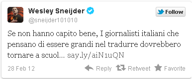 Ενοχλημένος με τους Ιταλούς δημοσιογράφους εμφανίστηκε ο Γουέσλεϊ Σνάιντερ, σύμφωνα με σχόλιο που ανάρτησε στην προσωπική του σελίδα στο Twitter.