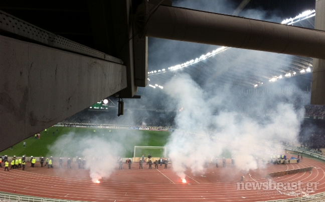 Νέα διακοπή στον ντέρμπι οχτώ λεπτά πριν τη λήξη του. Ο διαιτητής Κάκος οδήγησε τους παίχτες στη φυσούνα προς τα αποδυτήρια καθώς οπαδοί των πρασίνων ξεκίνησαν να πετούν μολότοφ και μπουκάλια στον αγωνιστικό χώρο.