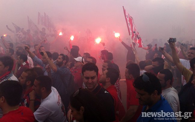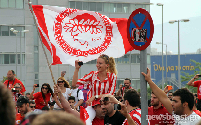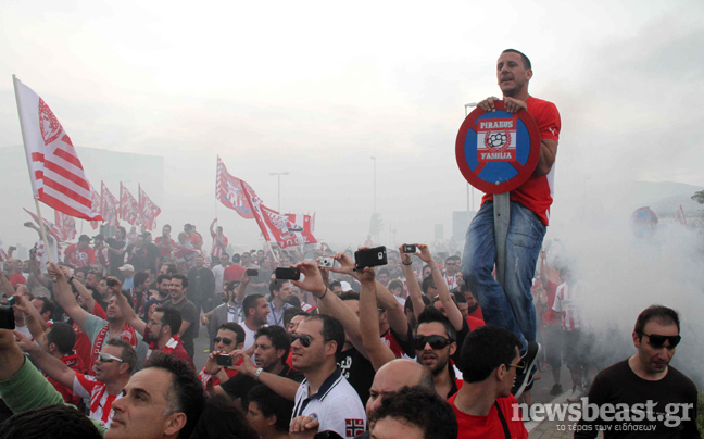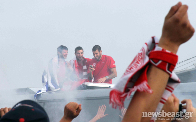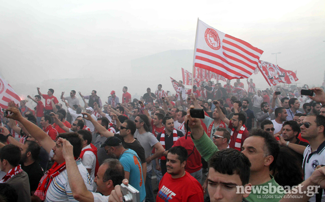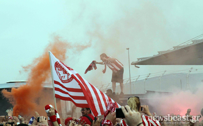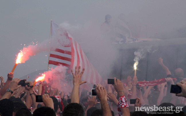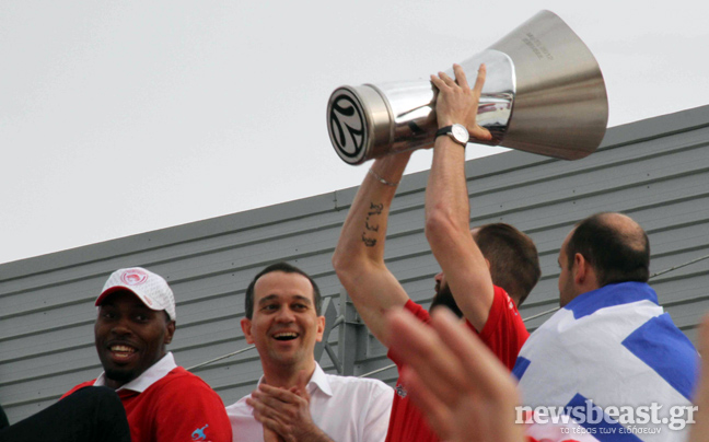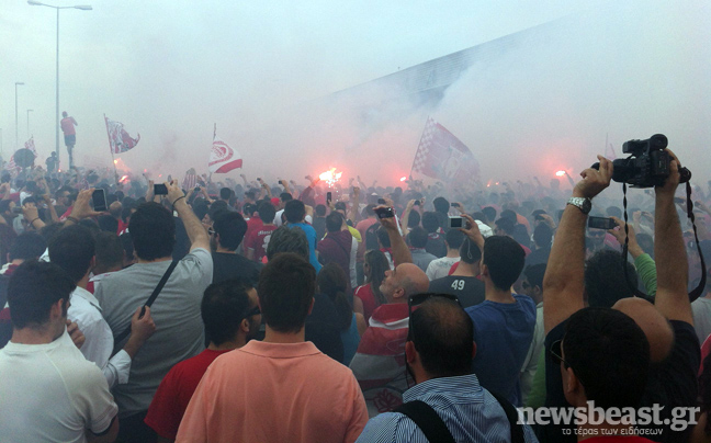 Λίγο μετά τις 18:00, σε πραγματικό πανδαιμόνιο ενθουσιασμού οι ερυθρόλευκοι φίλαθλοι αποθέωσαν την αποστολή των Πρωταθλητών Ευρώπης. Την παράσταση έκλεψαν Παπανικολάου, Πρίντεζης, Μάντζαρης, Ντόρσεϊ αλλά και οι Γιώργος και Παναγιώτης Αγγελόπουλος που βγήκαν στην οροφή του πούλμαν με την κούπα, οπότε και επικράτησε πανικός.