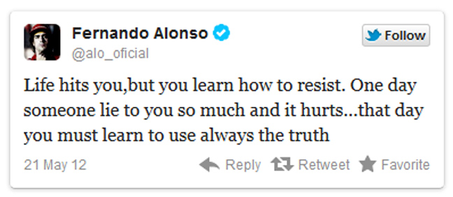 Κάποιο πρόβλημα φαίνεται πως απασχολεί τον Ισπανό πιλότο, ο οποίος δεν δίστασε να κοινοποιήσει στον λογαριασμό του στο twitter, αποφθέγματα περί… χτυπημάτων της ζωής, ψέματα και αλήθειες…