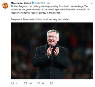 Ανακοίνωση της Μάντσεστερ Γιουνάιτεντ αναφέρει ότι ο Φέργκιουσον υποβλήθηκε σε έκτακτη χειρουργική επέμβαση για εγκεφαλική αιμορραγία.