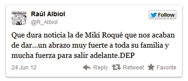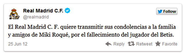 «Η διοίκηση της Ρεάλ Μαδρίτης θέλει να εκφράσει τα συλλυπητήριά της στην οικογένεια και τους φίλους του Μίκι Ροκέ, σχετικά με τον θάνατο του παίκτη της Μπέτις»