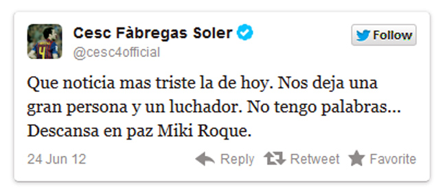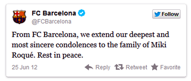 «Στην Μπαρτσελόνα εκφράζουμε τα πιο βαθιά και ειλικρινή μας συλλυπητήρια στην οικογένεια του Μίκι Ροκέ. Αναπαύσου εν ειρήνη…».