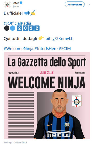 Στην Ίντερ θα συνεχίσει και τυπικά την καριέρα του ο Ράτζα Ναϊνγκολάν, ο οποίος ανακοινώθηκε από τον σύλλογο του Μιλάνου. Ο Βέλγος μέσος υπέγραψε συμβόλαιο διάρκειας τεσσάρων ετών, που θα τον κρατήσει στο «Τζιουζέπε Μεάτσα» μέχρι το 2022, ενώ από το deal εποφελήθηκε και η Ρόμα, η οποία έβαλε στα ταμεία της 24 εκατ. ευρώ, προσθέτοντας παράλληλα στο πρόσθεσε στο ρόστερ τους Ντάβιντε Σαντόν και Νικολό Ζανιόλο, με τον τελευταίο να θεωρείται ένας από τους πλέον ταλαντούχους παίκτες του κάλτσιο. Οι «νερατζούρι» ανακοίνωσαν τη μεταγραφή του Ναϊνγκολάν με δημοσιογραφικό τρόπο, καθώς ανάρτησαν την είδηση στα social media με ένα σκίτσο της εφημερίδας Gazzetta dello Sport, στην οποία πρώτο θέμα ήταν η μετακίνηση του παίκτη στη Λομβαρδία και είχε τίτλο: «Καλωσόρισες νίντζα».