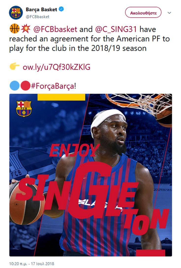 Πλέον είναι και επίσημο αφού η Μπαρτσελόνα ανακοίνωσε την απόκτηση του Κρις Σίνγκλετον για έναν χρόνο. Ο Αμερικανός φόργουορντ ύστερα από δύο χρόνια στον Παναθηναϊκό θα συνεχίσει την καριέρα του στην Βαρκελώνη αφού συμφώνησε με την Μπαρτσελόνα για έναν χρόνο. Οι απολαβές του Σίνγκλετον για την σεζόν 2018-19 ανέρχονται στα 2 εκατομμύρια δολάρια (2,05 για την ακρίβεια), χρήματα που δεν μπορούσε σε καμία περίπτωση να ανταγωνιστεί ο Παναθηναϊκός.