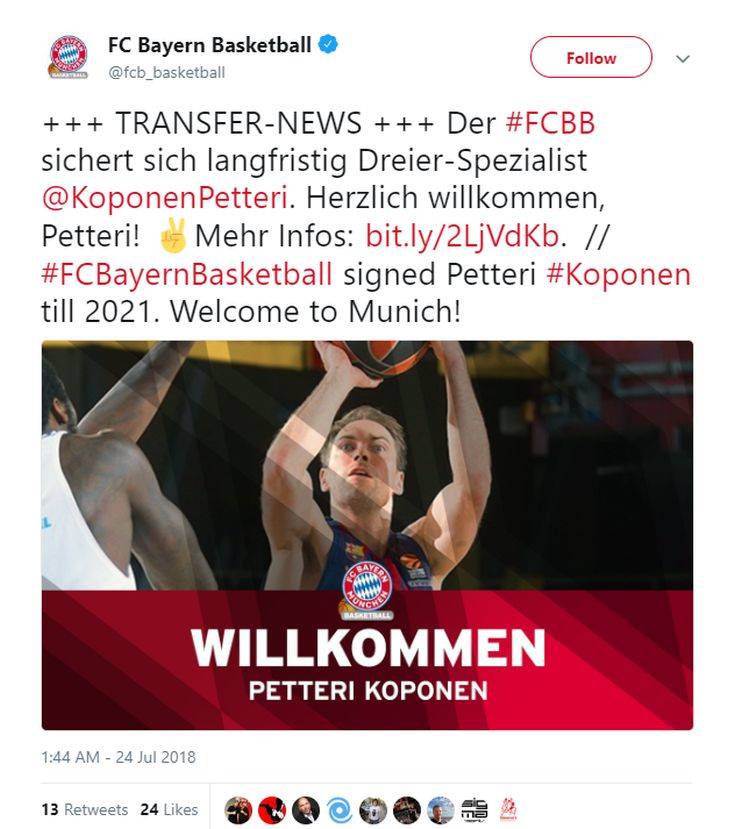 Η Μπάγερν Μονάχου ανακοίνωσε και επίσημα την απόκτηση του Πέτερι Κόπονεν, ο οποίος υπέγραψε συμβόλαιο μέχρι το καλοκαίρι του 2021. Το χρονικό του προαναγγελθέντος γάμου ολοκληρώθηκε πολύ γρήγορα, αφού από τη στιγμή που έγινε γνωστό ότι «κλείνει» στην Μπάγερν, δεν χρειάστηκε να περάσει αρκετή ώρα. Η ομάδα του Μονάχου που επιστρέφει στη φετινή EuroLeague, ανακοίνωσε και επίσημα την απόκτηση του Φινλανδού, ο οποίος υπέγραψε τριετές συμβόλαιο.