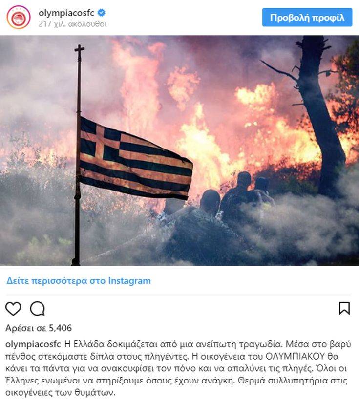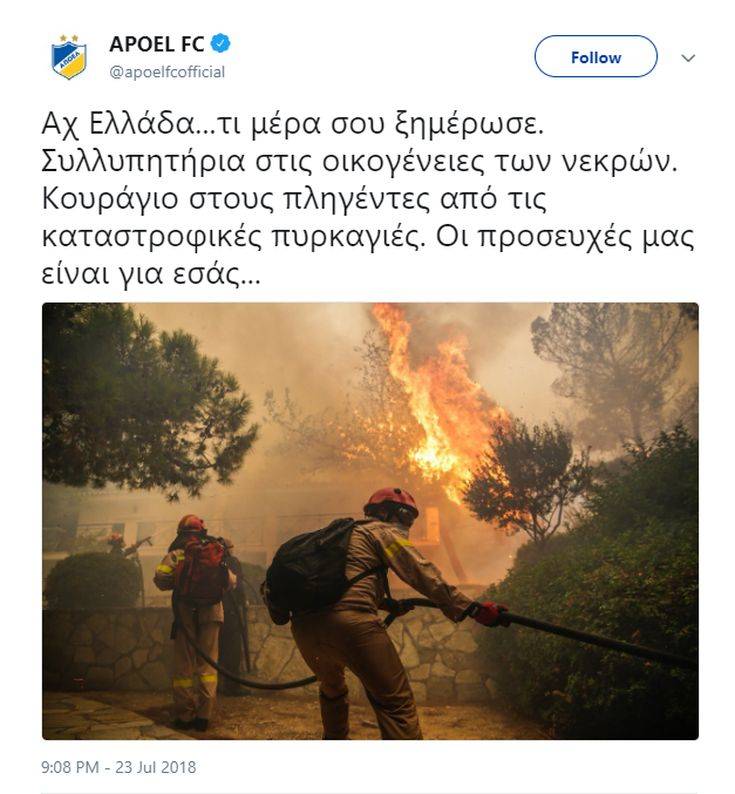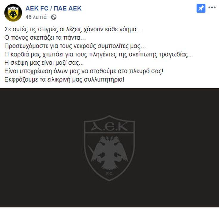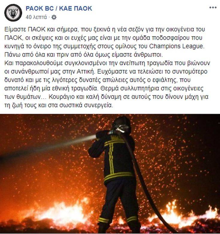 Ο αθλητικός κόσμος της χώρας εξέφρασε την οδύνη του για τις ανθρώπινες απώλειες και τις καταστροφικές ζημιές που προκάλεσαν οι πυρκαγιές στην Αττική με μηνύματα στα social media. Η ΑΕΚ με ανάρτηση στα μέσα κοινωνικής δικτύωσης εκφράζει τα ειλικρινή της συλλυπητήρια για τα θύματα των φονικών πυρκαγιών τονίζοντας πως είναι υποχρέωση όλων να σταθούν στο πλευρό τους. Αναλυτικά η ανάρτηση της ΑΕΚ: