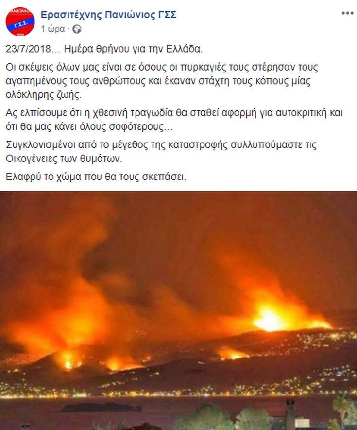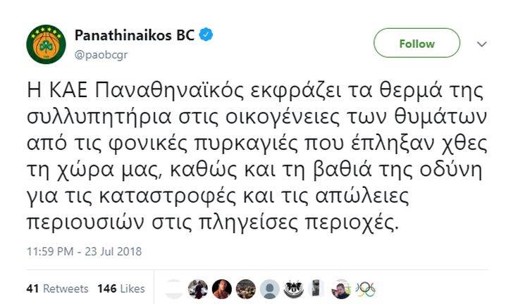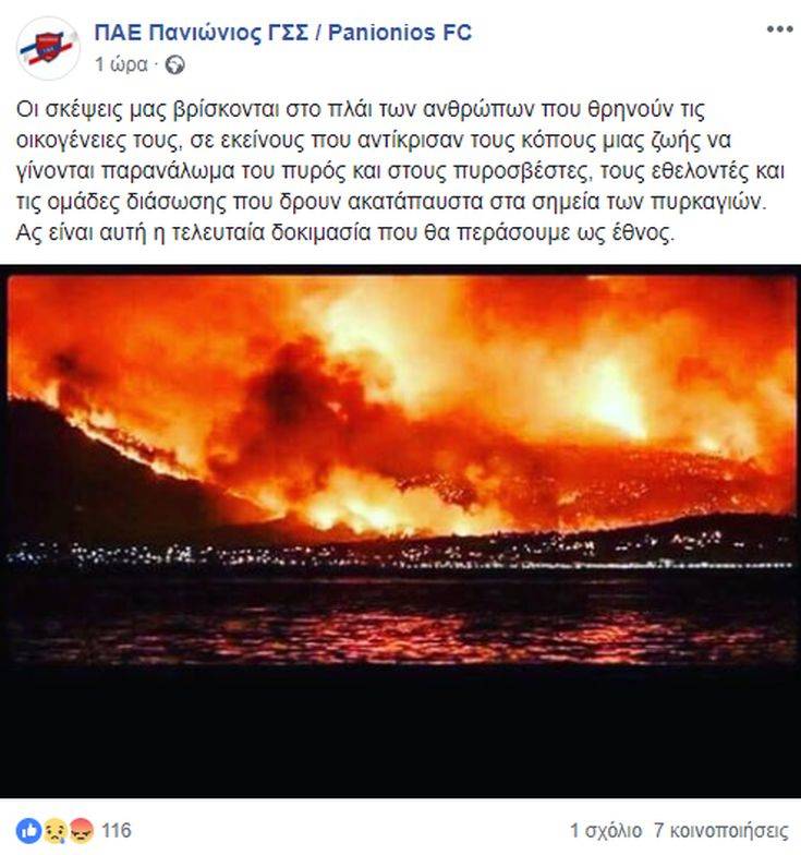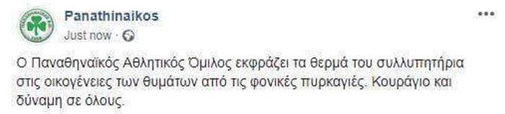 Ο Ερασιτέχνης Παναθηναϊκός εξέφρασε τα συλλυπητήρια στις οικογένειες των θυμάτων από τις φονικές πυρκαγιές. Αναλυτικά η ανάρτηση του Ερασιτέχνη Παναθηναϊκού στο facebook: «Ο Παναθηναϊκός Αθλητικός Όμιλος εκφράζει τα θερμά του συλλυπητήρια στις οικογένειες των θυμάτων από τις φονικές πυρκαγιές. Κουράγιο και δύναμη σε όλους».