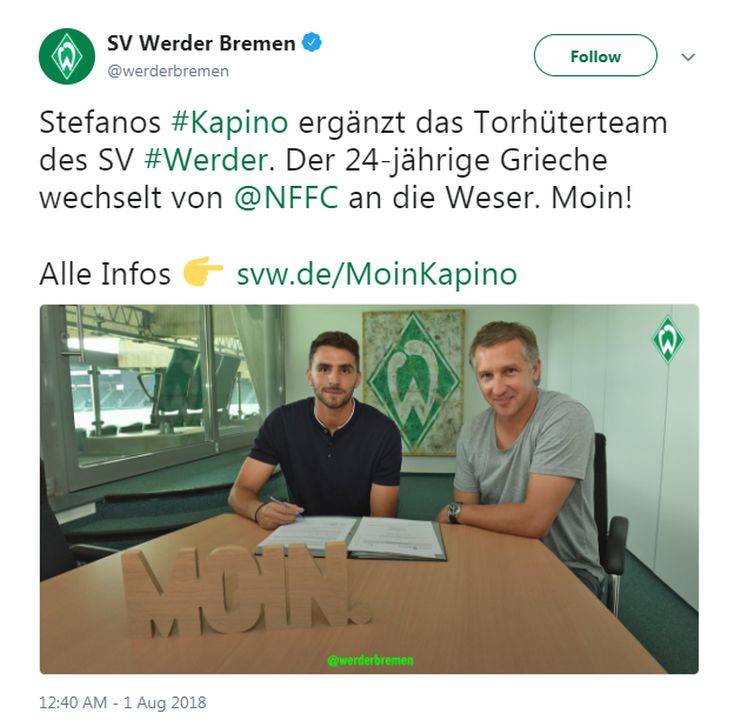 Ο Στέφανος Καπίνο ανακοινώθηκε από τη Βέρντερ Βρέμης, με τον παίκτη να επιστρέφει στη Γερμανία ύστερα από 4 χρόνια. Ήταν γνωστό ότι ο Καπίνο οδεύει προς Βέρντερ, πλέον όμως, είναι και επίσημο με τον παίκτη να υπογράφει συμβόλαιο διάρκειας 2+1 χρόνια. Έτσι, μετά τον Ολυμπιακό και το πέρασμά του από τη Νότιγχαμ Φόρεστ, ο 24χρονος πορτιέρο επιστρέφει στη Γερμανία. Θυμίζουμε ότι είχε βρεθεί στη Μάιντς τη σεζόν 2014-2015 και πλέον ανοίγει νέο κεφάλαιο στην καριέρα του.