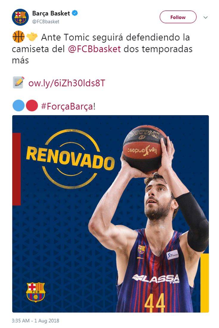 Τη φανέλα της Μπαρτσελόνα θα συνεχίσει να φορά για δύο ακόμη χρόνια ο Άντε Τόμιτς. Οι «μπλαουγκράνα» ανακοίνωσαν πως ο Κροάτης σέντερ θα είναι κάτοικος Βαρκελώνης για δύο ακόμη χρόνια, αφού οι δυο πλευρές επέκτειναν τη συνεργασία τους. Την σεζόν που μας πέρασε ο Κροάτης ψηλός είχε 9.7 πόντους και 4.9 ριμπάουντ ανά ματς στην Euroleague.
