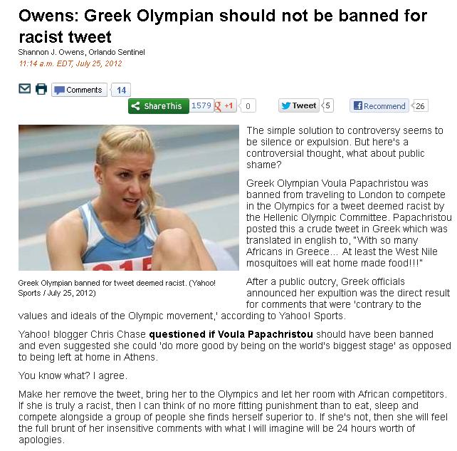 Η Παπαχρήστου μπορεί να έχει αμφισβητήσιμο χαρακτήρα αλλά είναι μία αθλήτρια που αφιέρωσε τέσσερα χρόνια από τη ζωή της για τη στιγμή αυτή. Οι Ολυμπιακοί αθλητές προπονούνται πιο σκληρά από κάθε άλλο αθλητή στον κόσμο καθώς οι στιγμές της δόξας έρχονται μόνο κάθε τέσσερα χρόνια. Δεν θα ήθελα αυτό να το στερηθεί κανείς, ούτε κι ένας ρατσιστής», καταλήγει.
