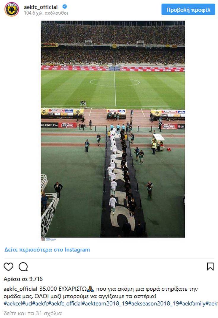 Η πρόκριση επί της Σέλτικ και ο ανοιχτός «δρόμος» προς τους ομίλους του Champions League έχουν φέρει ευφορία στην ΑΕΚ, που ευχαρίστησε τους φιλάθλους της για τη στήριξη το βράδυ της Τρίτης (14/8) στο ΟΑΚΑ. «35.000 ευχαριστώ που για ακόμη μια φορά στηρίξατε την ομάδα μας. Όλοι μαζί μπορούμε να αγγίξουμε τα αστέρια!», ήταν το μήνυμα των «κιτρινόμαυρων» στον κόσμο τους, που συνέρευσε στο ΟΑΚΑ για να στηρίξει την προσπάθεια του Μαρίνου Ουζουνίδη και των παικτών του. Δείτε τη φωτογραφία στον επίσημο λογαριασμό της Ένωσης στο Instagram.