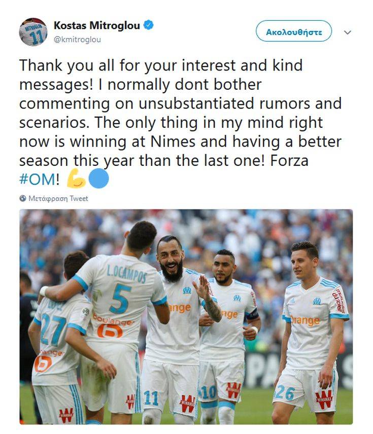 Σύμφωνα με δημοσιεύματα από Τουρκία και Γαλλία, ο Κώστας Μήτρογλου βρίσκεται εκτός πλάνων του Ρούντι Γκαρσία για τη νέα σεζόν στη Μαρσέιγ. Μάλιστα, φέρεται να είναι ο πρώτος μεταγραφικός στόχος για την Μπεσίτκας, που αναζητά παίκτη αντί του Νεγρέδο. Ο ίδιος ο διεθνής επιθετικός, πάντως, δεν φαίνεται να δίνει ιδιαίτερη βάση στα σχετικά δημοσιεύματα και απάντησε μέσω Twitter ότι αυτό που τον ενδιαφέρει είναι να πάει καλά η ομάδα της Μασσαλίας με εκείνον στις τάξεις της. «Ευχαριστώ για το ενδιαφέρον σας και για τα ευγενικά σας μηνύματα. Συνήθως δεν ασχολούμαι με τα αβάσιμα σενάρια και της φήμες. Το μόνο που έχω στο μυαλό είναι τώρα, να κερδίσουμε τη Νιμ και να έχω καλύτερη σεζόν από την προηγούμενη. Πάμε Μαρσέιγ», ήταν η ανάρτηση του 30χρονου Έλληνα φορ.