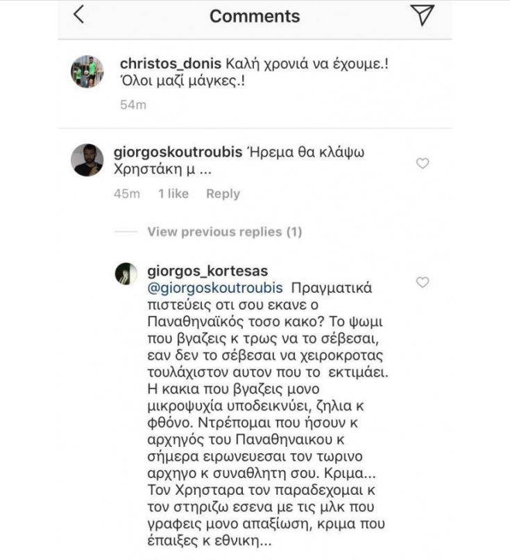 Οι «πράσινοι» νίκησαν 2-0 στον Λεβαδειακό στο φιλικό-πρόβα τζενεράλε για το ξεκίνημα της Σούπερ Λγικ και ο Χρήστος Δώνης μέσω Instagram έδωσε το σύνθημα για τη νέα σεζόν: «Καλή χρονιά να έχουμε! Όλοι μαζί μάγκες!». Ακολούθησαν υποστηρικτικά μηνύματα από φίλους του Παναθηναϊκού και κάπου εκεί αποφάσισε να μπει στην κουβέντα και ο Γιώργος Κουτρουμπής. Ο πρώην παίκτης του «τριφυλλιού» απάντησε: «Ήρεμα, θα κλάψω Χρηστάκη μου…», με αποτέλεσμα να προκαλέσει την αντίδραση αρκετών «πράσινων» οπαδών, οι οποίοι εξέλαβαν την απάντησή του ως ειρωνική και να μπει σε λεκτική αντιπαράθεση μαζί τους…