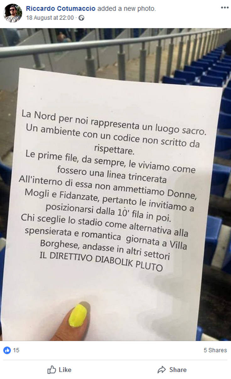 Η Κούρβα Νορντ του «Ολίμπικο» της Ρώμης, εκεί όπου παραδοσιακά κάθονται οι οργανωμένοι οπαδοί της Λάτσιο, δεν φημίζεται για τον δημοκρατικό χαρακτήρα της. Για την ακρίβεια, κατά καιρούς έχουν ακουστεί συνθήματα που αποθεώνουν τους ναζί, τον φασισμό στην Ιταλία και τον Μπενίτο Μουσολίνι, στιχομυθίες μίσους εναντίον των Εβραίων, ρατσιστικά σχόλια κατά μαύρου δέρματος ανθρώπων και πολλά ακόμη παρεμφερή. Παρά τις προσπάθειες της διοίκησης των «λατσιάλι» να… στρώσουν χαρακτήρα σε μερίδα των τιφόζι τους, εκείνοι δεν φαίνεται να πτοούνται. Στο παιχνίδι με αντίπαλό τη Νάπολι, το δεύτερο χρονικά της έναρξης για τη νέα σεζόν στη Serie A, μοίρασαν φυλλάδια με τα οποία ξεκαθάριζαν ότι η παρουσία γυναικών στις πρώτες σειρές του βορείου πετάλου του γηπέδου δεν είναι επιθυμητή. Μάλιστα, προέτρεψαν όσους και όσες αντιλαμβάνονται την επίσκεψη στο «Ολίμπικο» ως μια… ρομαντική βόλτα, να πάνε σε άλλες θύρες και όχι εκεί που κάθονται αυτοί. Ή τουλάχιστον, να οπισθοχωρήσουν σε άλλες θύρες. «Η Curva Nord αντιπροσωπεύει για μας ένα ιερό μέρος, ένα περιβάλλον με άγραφους κώδικες που οφείλουμε να σεβόμαστε. Οι πρώτες σειρές, όπως πάντα, τις ζούμε σαν να ήταν μία γραμμή σε τάφρο. Στο εσωτερικό της δεν αποδεχόμαστε γυναίκες, συζύγους ή φίλες, για αυτό τις καλούμε να παίρνουν θέση από τη δέκατη σειρά και πίσω. Όποιος βλέπει το στάδιο ως εναλλακτική για μία ανέμελη και ρομαντική ημέρα στη Βίλα Μποργκέζε, να πάει σε άλλες θύρες», ήταν το μήνυμα του φυλλαδίου.