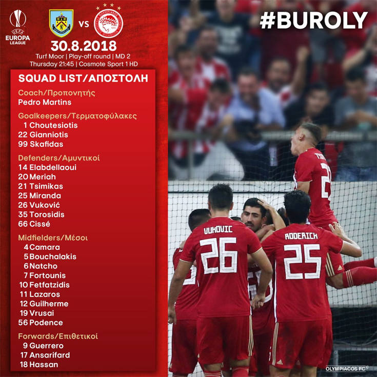 Αναλυτικά η αποστολή του Ολυμπιακού: Χουτεσιώτης, Γιαννιώτης, Σκαφίδας, Ομάρ, Μεριά, Τσιμίκας, Μιράντα, Βούκοβιτς, Τοροσίδης, Σισέ, Καμαρά, Μπουχαλάκης, Νάτχο, Φορτούνης, Φετφατζίδης, Λάζαρος, Γκιγιέρμε, Βρουσάι, Ποντένσε, Γκερέρο, Ανσαριφάρντ, Χασάν.