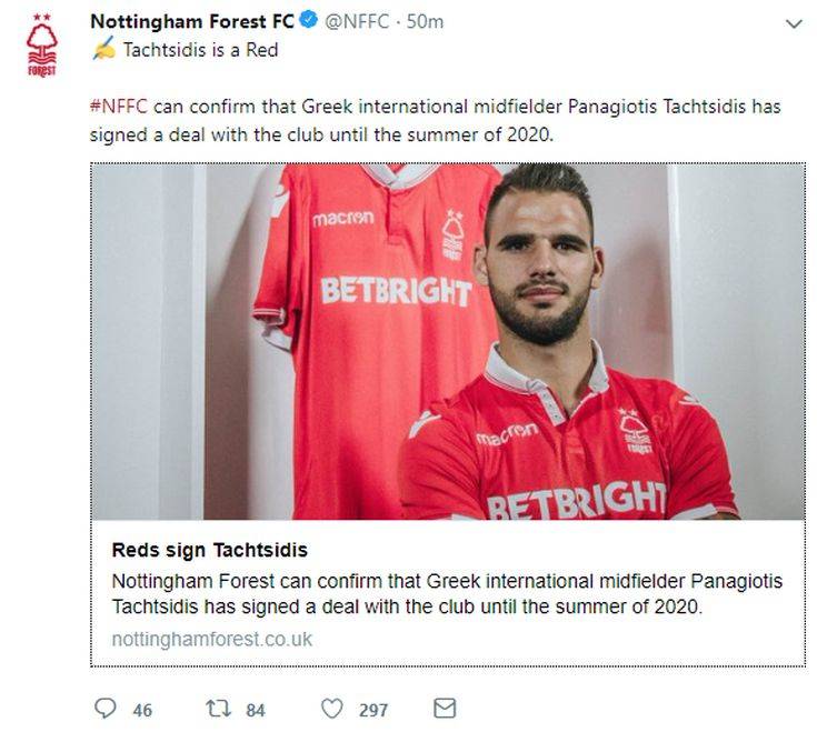 Παίκτης της Νότιγχαμ Φόρεστ για τα επόμενα δύο χρόνια είναι από το μεσημέρι της Τετάρτης ο Παναγιώτης Ταχτσίδης, μετακομίζοντας στον αγγλικό σύλλογο από τον Ολυμπιακό.