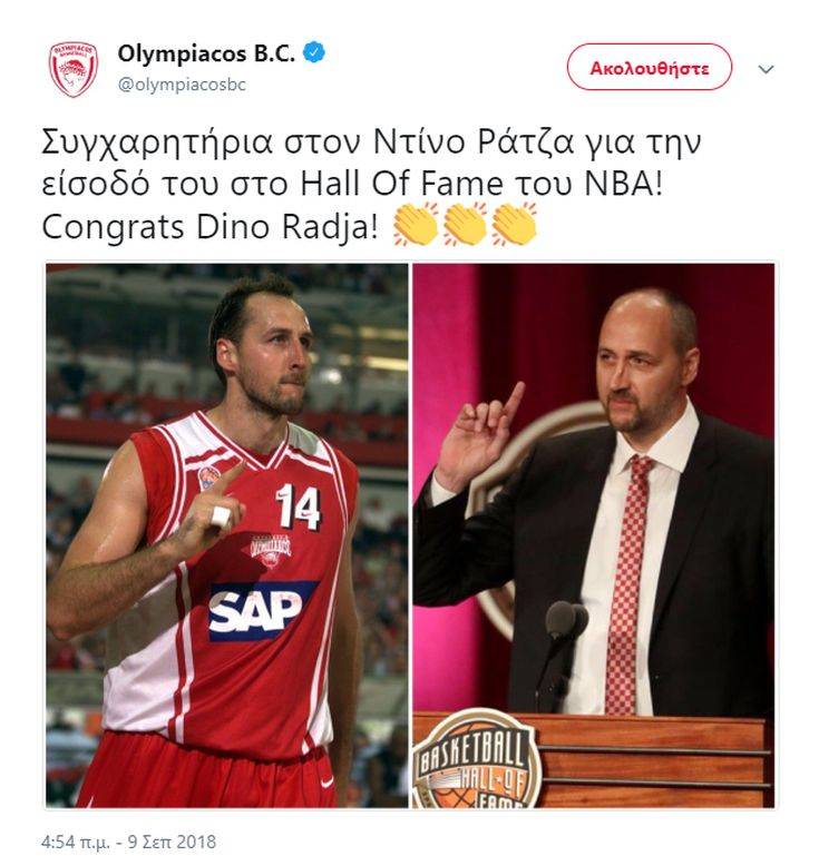 «Συγχαρητήρια στον Ντίνο Ράτζα για την είσοδό του στο Hall Of Fame του ΝΒΑ!», αναφέρει η ανάρτηση.