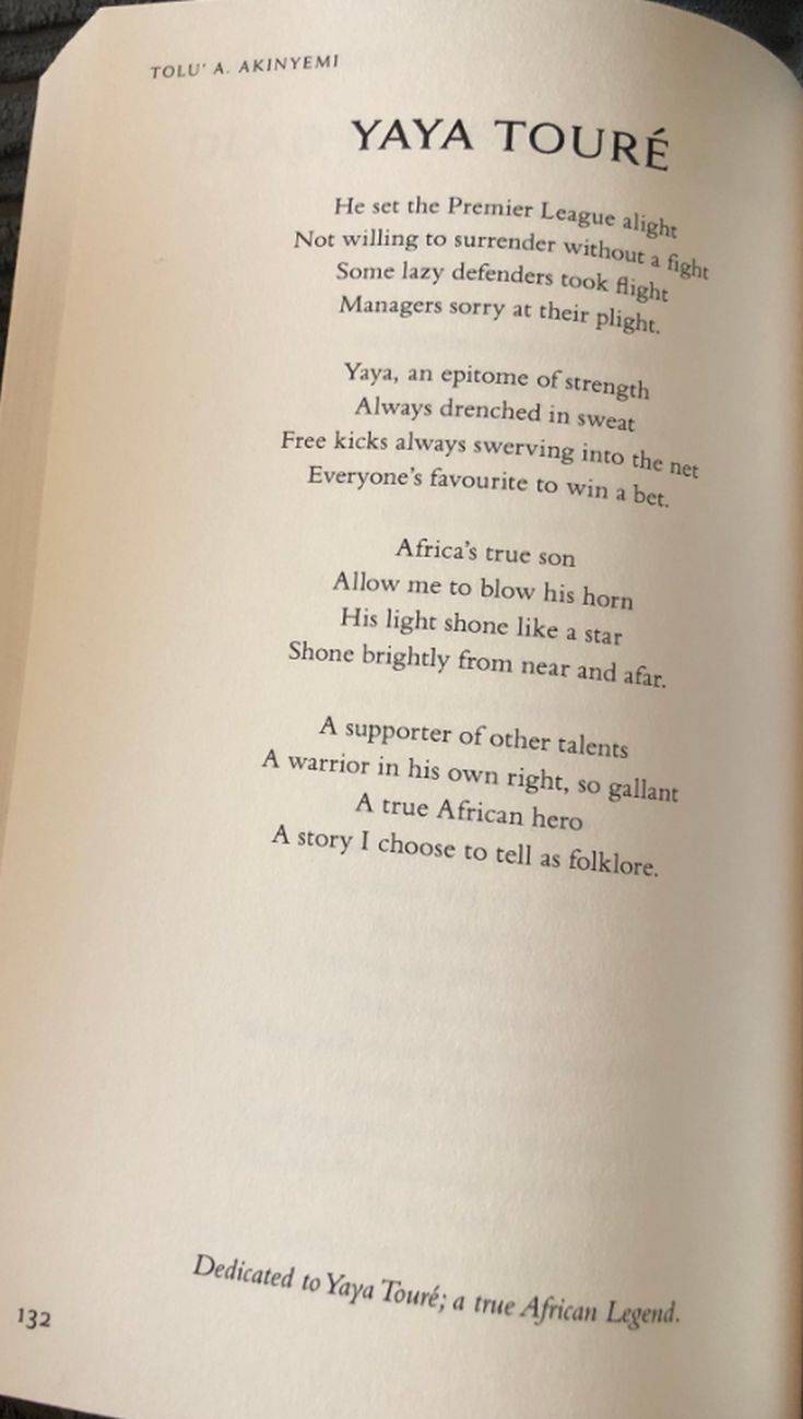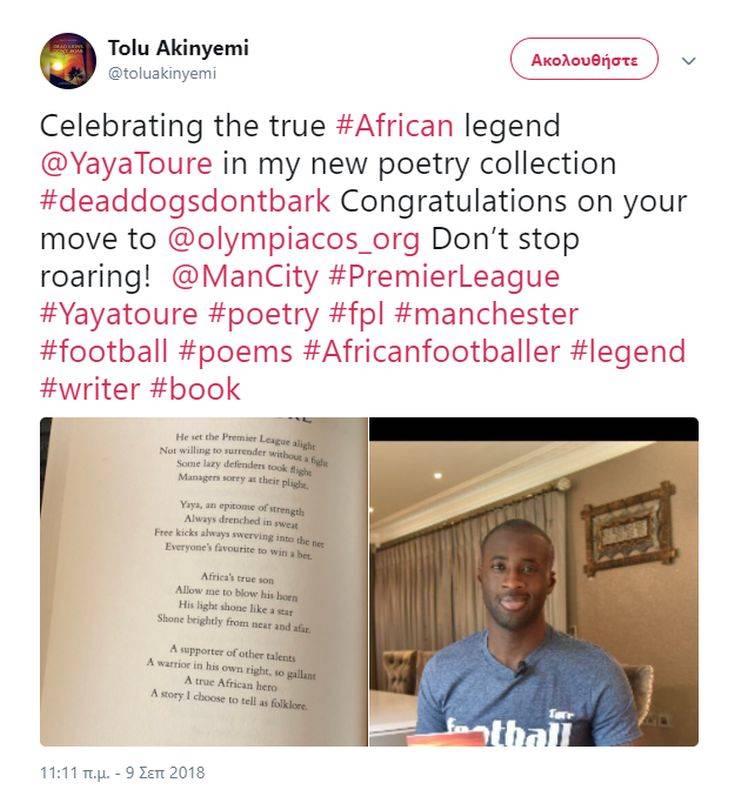 Ποιητική συλλογή εξέδωσε ο Αφρικανός συγγραφέας και ποιητής, Τόλου Ακινγκέμι, εμπνευσμένος από την καριέρα του παίκτη του Ολυμπιακού Γιάγια Τουρέ, κυρίως στα γήπεδα της Αγγλίας.