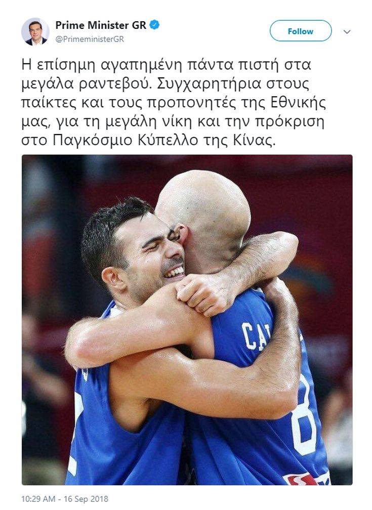 «Η επίσημη αγαπημένη πάντα πιστή στα μεγάλα ραντεβού. Συγχαρητήρια στους παίκτες και τους προπονητές της Εθνικής μας, για τη μεγάλη νίκη και την πρόκριση στο Παγκόσμιο Κύπελλο της Κίνας» αναφέρει στον προσωπικό του λογαριασμό στο Twitter ο πρωθυπουργός Αλέξης Τσίπρας. Η ανάρτηση συνοδεύεται και από μια συγκινητική φωτογραφία που απαθανατίζει τη στιγμή, όπως αναφέρει το Αθηναϊκό Πρακτορείο Ειδήσεων.