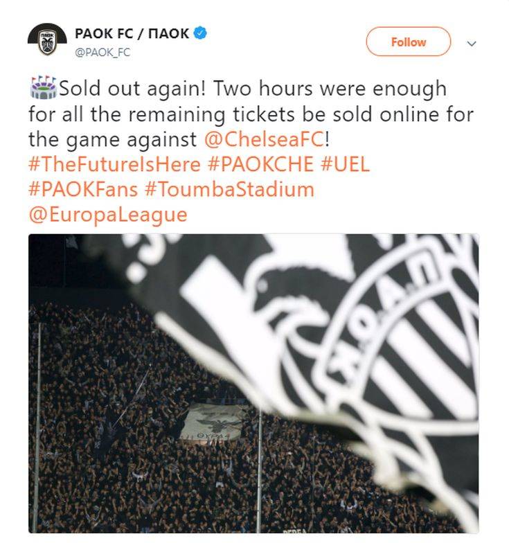 Για ακόμη ένα ευρωπαϊκό παιχνίδι η Τούμπα θα είναι κατάμεστη, καθώς τα λίγα εισιτήρια που βρίσκονταν στη διάθεση των φίλων του ΠΑΟΚ, για το παιχνίδι με αντίπαλο την Τσέλσι, έκαναν… φτερά μέσα σε δύο ώρες.