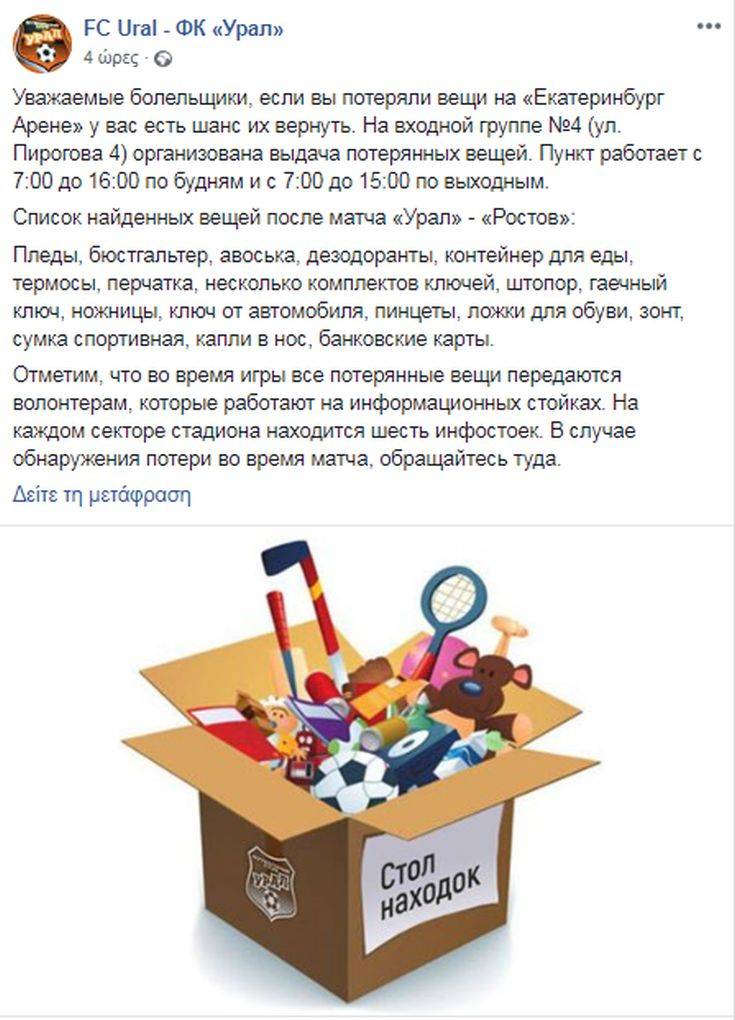 Η Ουράλ υποδέχθηκε την Ροστόφ πριν λίγες ημέρες για την πρώτη κατηγορία στη Ρωσία και οι υπάλληλοι του μουντιαλικού σταδίου στο Γιεκατερίνενμπουργκ συγκέντρωσαν όλα τα αντικείμενα που ξέχασαν οι οπαδοί. Ανάμεσά τους και ένα… σουτιέν, που άφησε μία οπαδός των γηπεδούχων! Ο σύλλογος ανακοίνωσε ότι όποια το ξέχασε μπορεί να το παραλάβει από τα γραφεία του συλλόγου…