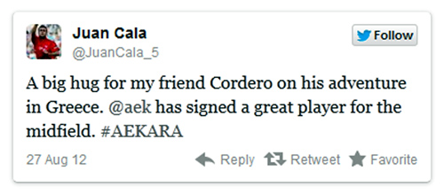 Ο Χουάν Κάλα προσυπογράφει την απόκτηση του Μιγκέλ Άνχελ Κορδέρο στην ΑΕΚ. Οι δυο τους υπήρξαν συμπαίκτες στις «μικρές» ομάδες της Σεβίλλης και ο Ισπανός αμυντικός μέσω του Twitter έστειλε τις ευχές του στον 25χρονο μέσο, που συμφώνησε με την «Ένωση».