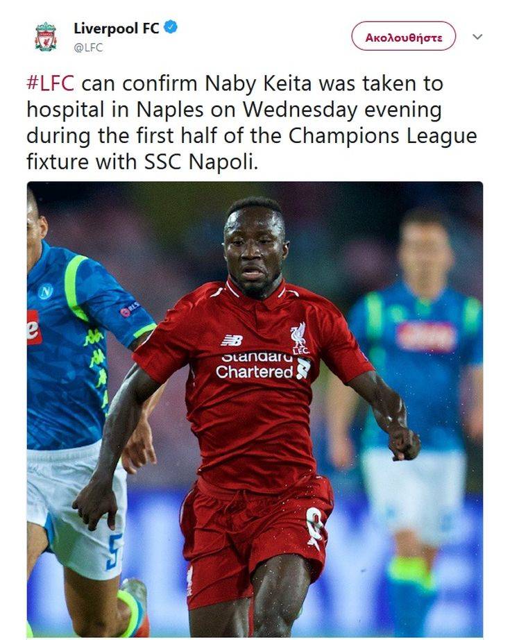 Ο αγώνας της Νάπολι με τη Λίβερπουλ βρίσκεται στο 16ο λεπτό, όταν όλοι στο «Σαν Πάολο» παγώνουν βλέποντας τον Ναμπί Κεϊτά να πέφτει στο χορτάρι. Ο μέσος της Λίβερπουλ διακομίστηκε άμεσα στο νοσοκομείο όπου ευτυχώς οι εξετάσεις έδειξαν πως δεν αντιμετωπίζει κάποιο πρόβλημα με την καρδιά. Ο 23χρονος ποδοσφαιριστής από την Γουινέα θα παραμένει για να κάνει και άλλες εξετάσεις, αλλά σίγουρα τα πρώτα νέα είναι το λιγότερο ευχάριστα.