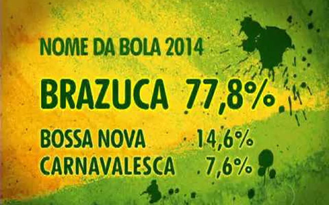Η «διάδοχος» της «Τζαμπουλάνι», που «φιλοδοξεί» να μας «μαγέψει» στα γήπεδα της Βραζιλίας, από τη Δευτέρα έχει όνομα: «Μπραζούκα». Ένα όνομα παράξενο, που επιλέχθηκε από το 70% όσων πήραν μέρος στην ψηφοφορία για τη «βάφτιση» της επίσημης μπάλας του Μουντιάλ του 2014.