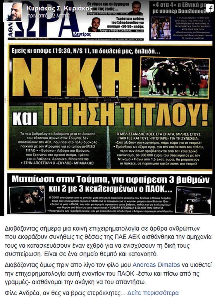 Το σχόλιο του Ανδρέα Δημάτου στο Facebook και τα όσα ανέφερε για τον ΠΑΟΚ, δίχως να τον κατονομάσει αλλά φροντίζοντας να τον «φωτογραφήσει», δεν πέρασαν απαρατήρητα από τους «ασπρόμαυρους», με τον υπεύθυνο επικοινωνίας της ΠΑΕ ΠΑΟΚ, Κυριάκο Κυριάκο, να απαντάει με τον ίδιο τρόπο και μέσα από μια μακροσκελή ανάρτηση στον προσωπικό του λογαριασμό στο Facebook να τονίζει: «Διαβάζοντας σήμερα μια κοινή επιχειρηματολογία σε άρθρα ανθρώπων που εκφράζουν συνήθως τις θέσεις της ΠΑΕ ΑΕΚ αισθάνθηκα την αμηχανία τους να κατασκευάσουν έναν εχθρό για να ενισχύσουν τη δική τους συσπείρωση. Είναι σε ένα σημείο θεμιτό και κατανοητό. Διαβάζοντας όμως πριν από λίγο τον φίλο μου Andreas Dimatos να υιοθετεί την επιχειρηματολογία αυτή εναντίον του ΠΑΟΚ -έστω και πίσω από τις γραμμές- αισθάνομαι την ανάγκη να του απαντήσω. Φίλε Ανδρέα, αν θες να βρεις ετερόκλητες συμμαχίες (από τη στιγμή που οι διαρροές σου είναι αρκετές για να αποδείξεις κάτι τέτοιο) ανέτρεξε στα πρωτοσέλιδα της Ώρας για Σπορ από τις 26 Φεβρουαρίου 2018 και μετά. Αν δεν πιστεύεις στα μάτια σου, δες και πιο πριν, μετά το ΠΑΣ Γιάννενα-ΠΑΟΚ. Αν θες να κατηγορήσεις τον ΠΑΟΚ, γιατί δεν τον «κατηγορείς» για την σιωπή του στην περυσινή εισβολή των ΜΑΤ στην κερκίδα της original στο μεταξύ μας παιχνίδι; Γιατί δεν κατηγορείς τον ΠΑΟΚ που δεν κατήγγειλε τη 10λεπτη διακοπή λόγω επεισοδίων στο ΑΕΚ-Ολυμπιακός; Αφού κρίνεις μια ομάδα από τις απόψεις των αρθρογράφων της, πες μου που συνάδει η σιωπή της ΑΕΚ με την ενορχηστρωμένη από πέρυσι προσπάθεια να εμφανιστεί ο ΠΑΟΚ ως ευνοημένος; Για την απόφαση που άλλαξε μεσάνυχτα Σαββάτου; Από όλη εκείνη την εβδομάδα αυτό ήταν το σκάνδαλο; Τότε ο νόμος δεν είχε γράμμα και πνεύμα; Που είδατε να χαίρεται ο ΠΑΟΚ για την τιμωρία της ΑΕΚ; Διαβάσατε σήμερα αρθρογράφους από τη Θεσσαλονίκη; Κάνεις λάθος και στο έχω πει προσωπικά, να πιστεύεις ότι ο ΠΑΟΚ ελέγχει και καθοδηγεί την αρθρογραφία. Αν το κάναμε θα πιέζαμε δημοσιογράφους να φύγουν από τα ΜΜΕ που δουλεύουν, θα αρνούμασταν είσοδο σε δημοσιογράφους που μας «πλήγωσαν» και θα είχαμε και καμιά καταγγελία για εκβιασμό. Αν θες πάλι να μιλήσουμε για ισονομία, ας δούμε πως τιμωρήθηκαν οι δυο ομάδες για τον τελικό του Βόλου, λες και ΠΑΟΚτσήδες πλακώνονταν μόνοι τους. Αν θες να μιλήσουμε για κυνηγητό, ας δούμε ποιός κυνηγήθηκε και τιμωρήθηκε για να παίξει και να κερδίσει η ΑΕΚ το τελευταίο της κύπελλο. Αν θες να μετρήσουμε τις ποινές ας το κάνουμε και δεν θα βγει βολικό για την επιχειρηματολογία σου το αποτέλεσμα. Σήμερα λοιπόν με υπαινιγμούς απέναντί μας προσπαθείς να επαναλάβεις άλλη μια φορά το αφήγημα της «διαφορετικότητας» και της «ανωτερότητας» της ομάδας σου προφανώς απέναντί μας. Δυστυχώς η εβδομάδα που τελειώνει δεν είναι μια εβδομάδα που σου δίνει το timing και την ονοματολογία να μιλήσεις για αυτά. Και για να μην σου αφήσω απορίες. Κανείς στον ΠΑΟΚ δεν ασχολήθηκε με την τιμωρία της ΑΕΚ. Τα πρωταθλήματα πρέπει να παίζονται στα γήπεδα, με ισονομία, ανεξάρτητες και χωρίς φόβο διαιτησίες και οι ποινές πρέπει να είναι ίδιες για όλους και με στόχο να καταπολεμούν τη βία και όχι τους ποδοσφαιριστές και τους προπονητές. Παρότι δυστυχώς κανείς δεν θα φτάσει σε ποινές μηδενισμού τον ΠΑΟΚ, κανείς δεν θα στερηθεί απονομή πρωταθλήματος από ρολό χαρτί και από a la cart φόβο, εμείς το ίδιο ζητάμε και τώρα και τότε. Εσείς στην βολική για εσάς περίοδο, κρυφτήκατ
