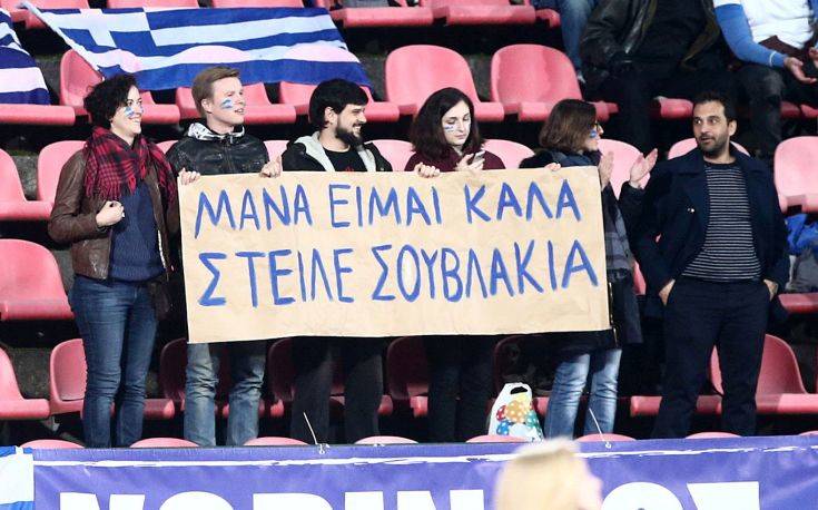 Μάλιστα, ο φωτογραφικός φακός «συνέλαβε» μία παρέα Ελλήνων φιλάθλων που με ένα χαρτόνι έστειλαν το δικό τους, ιδιαίτερο μήνυμα: «Μάνα είμαι καλά, στείλε σουβλάκια»!