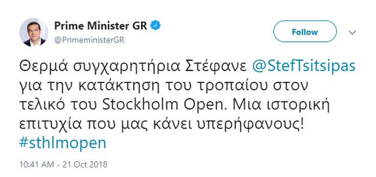 Τα θερμά συγχαρητήρια του στον Στέφανο Τσιτσιπά για την κατάκτηση του τροπαίου στον τελικό του Stockholm Open, εκφράζει ο πρωθυπουργός, Αλέξης Τσίπρας, με ανάρτηση του στο Twitter. «Μια ιστορική επιτυχία που μας κάνει υπερήφανους!» αναφέρει ο πρωθυπουργός.